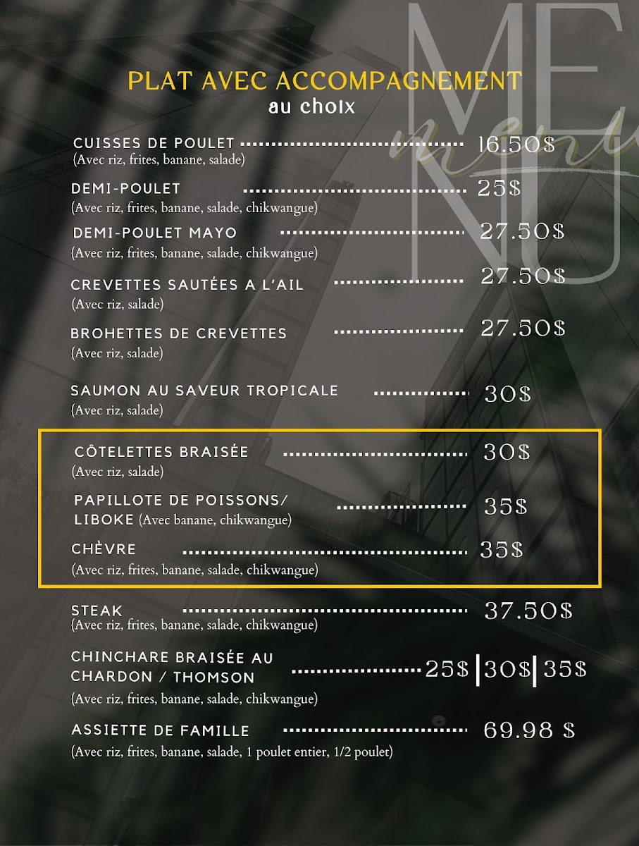 Meats feature selections such as smoked goat (Chèvre fumé) and lamb cooked over a wood fire, offering a variety of flavors representative of Central African cuisine.