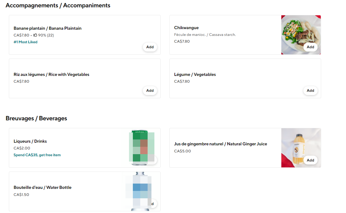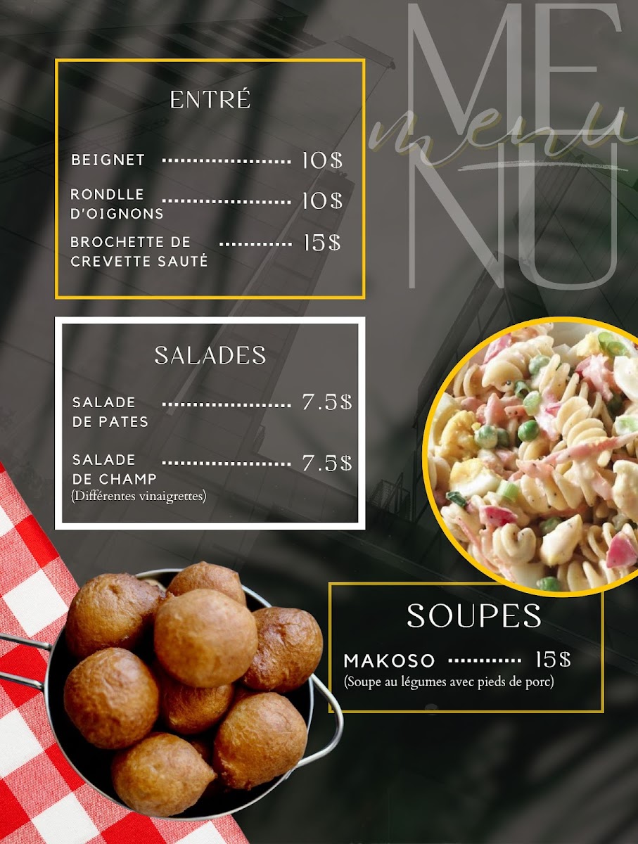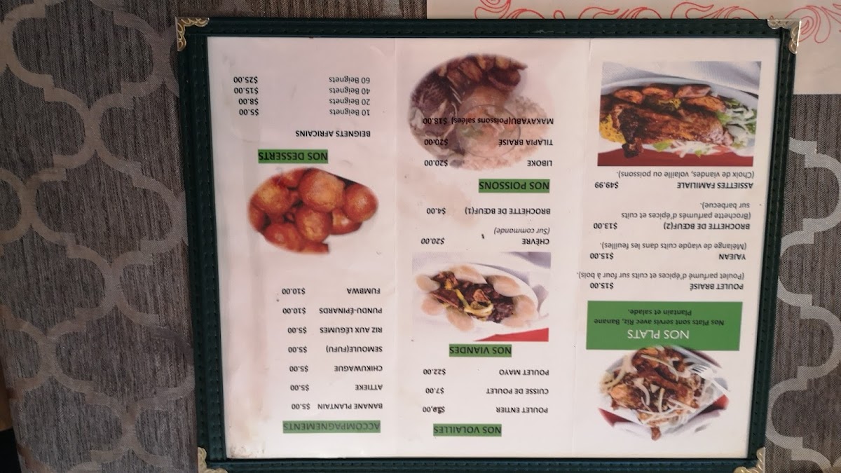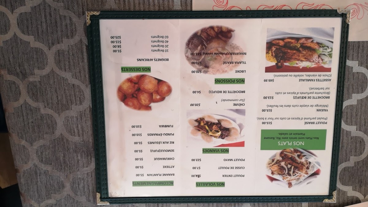 Additional menu highlights include specialty items like African chicken and Beignets Africains (African donuts), which provide options for those seeking lighter or snack-style foods.