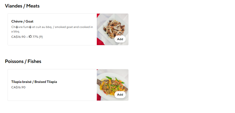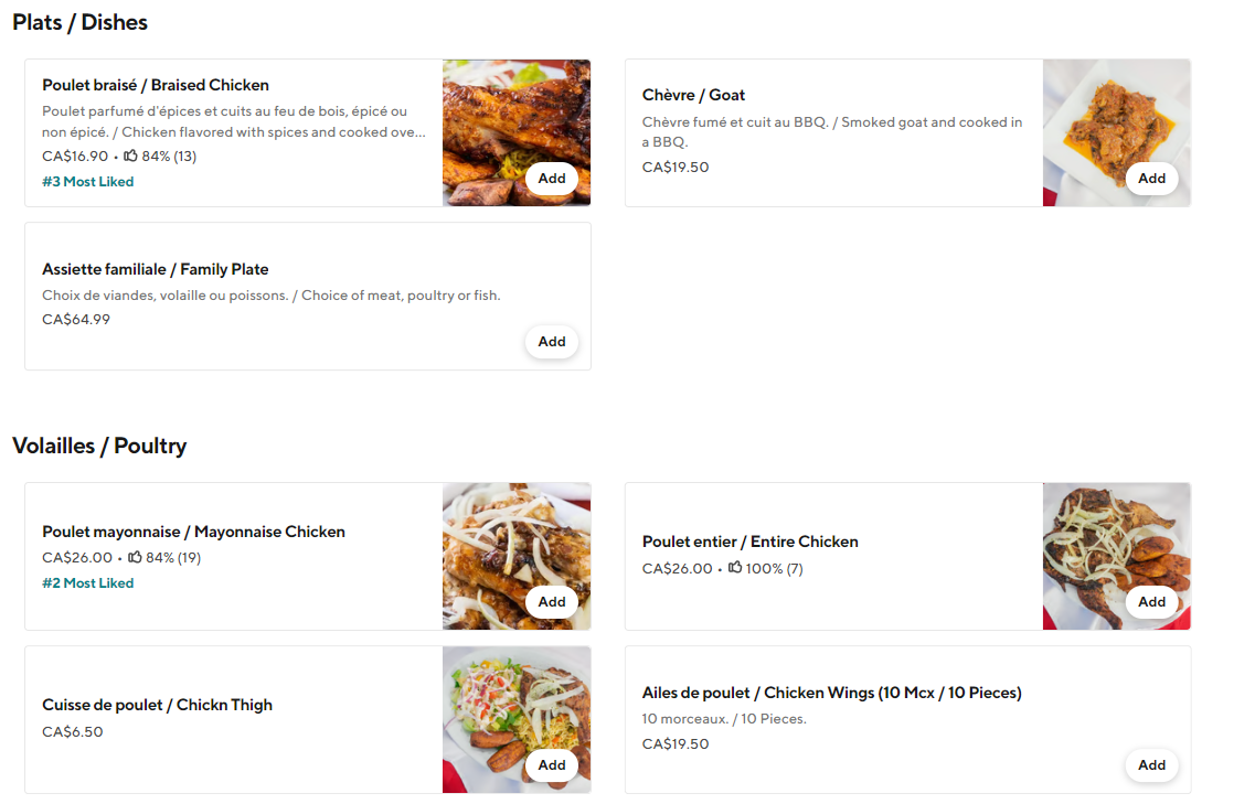 Dishes include items such as beef skewers (Brochette De Boeuf), braised tilapia, and braised chicken (Poulet Braisé). These dishes are typically prepared with a choice of spicy or non-spicy seasonings and often cooked on a BBQ.